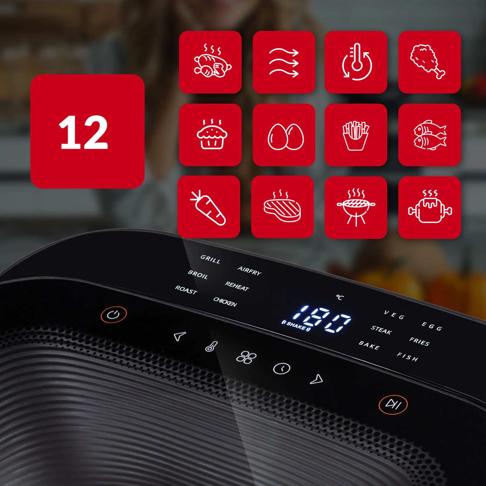 - 12 automatycznych programów — samodzielnie ustawia czas i temperaturę, co umożliwia idealne przygotowanie frytek, mięsa, warzyw czy deserów bez potrzeby ręcznego ustawiania.