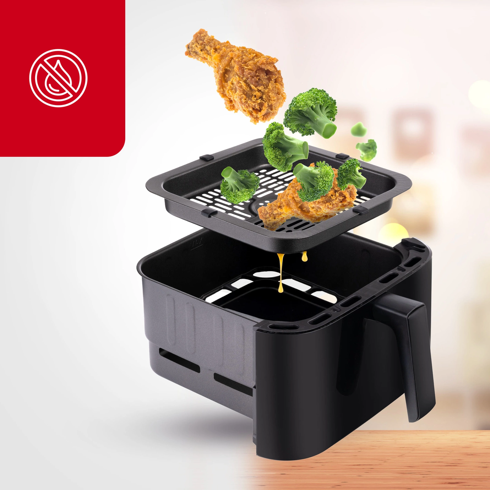 Konstrukcja kosza odprowadza nadmiar wilgoci i tłuszczu. Potrawy są lżejsze, a w kuchni nie unosi się zapach typowy dla smażenia na tłuszczu.