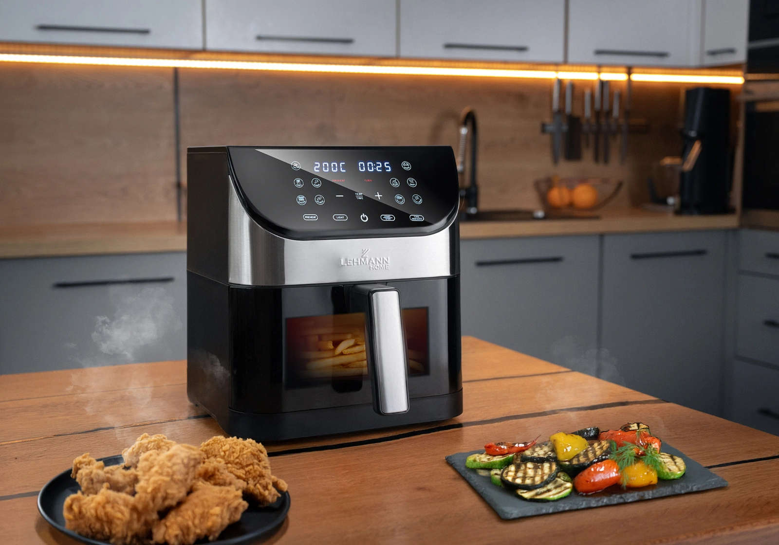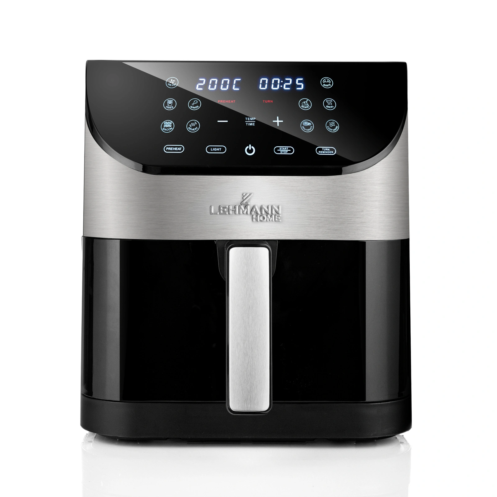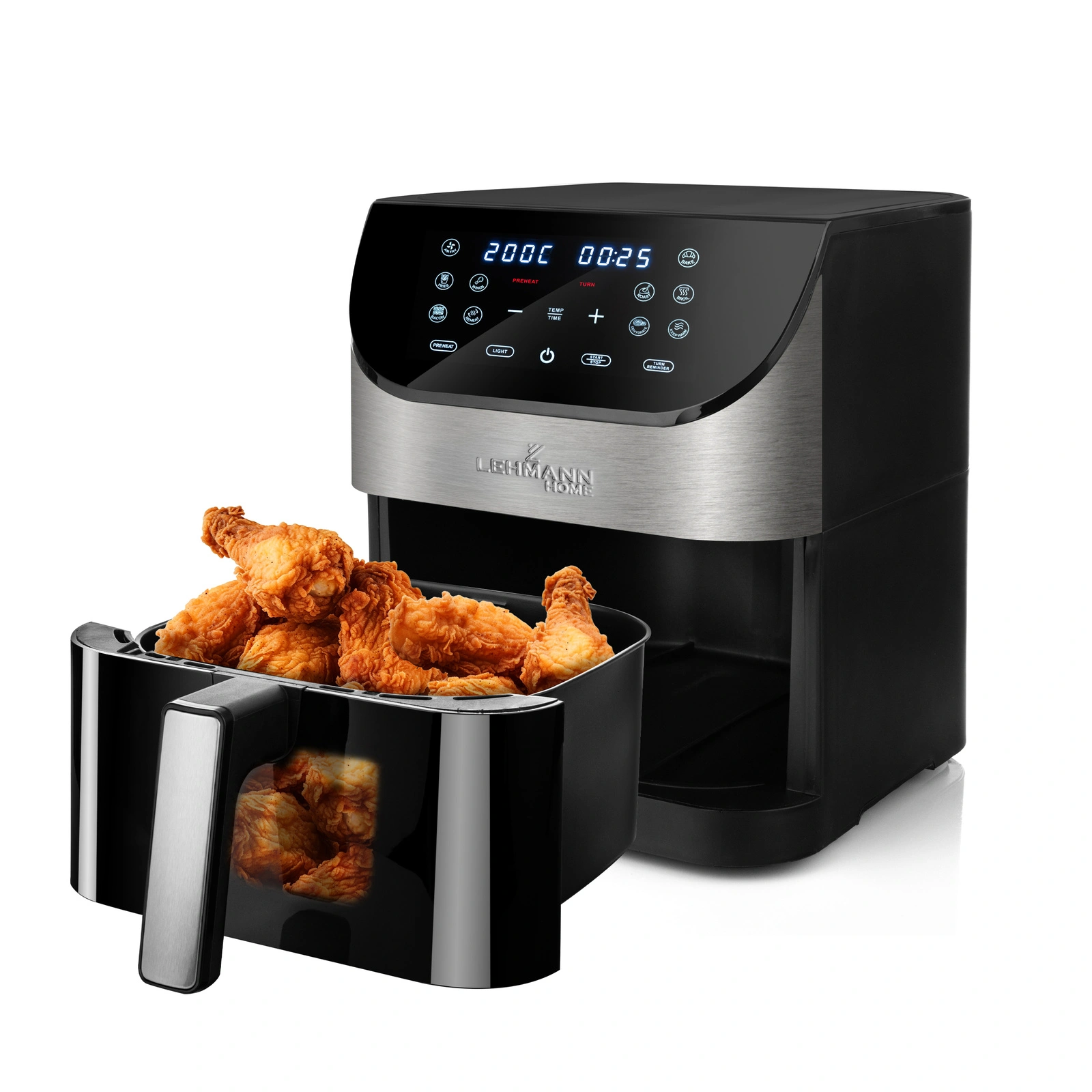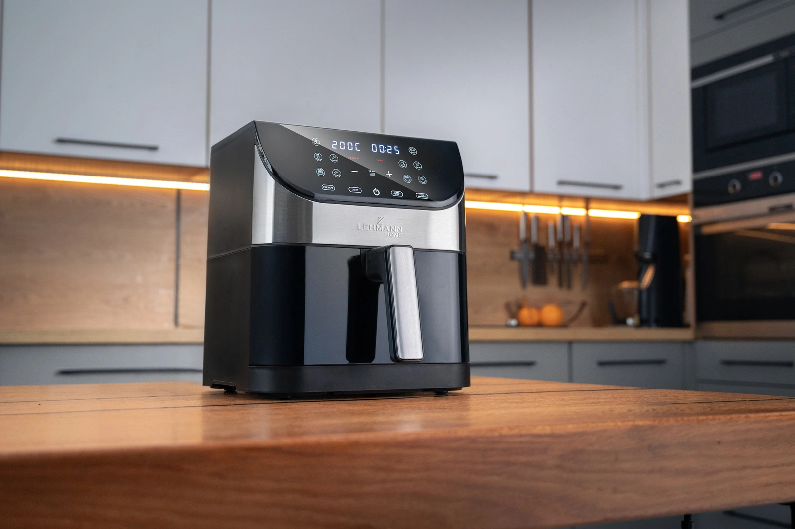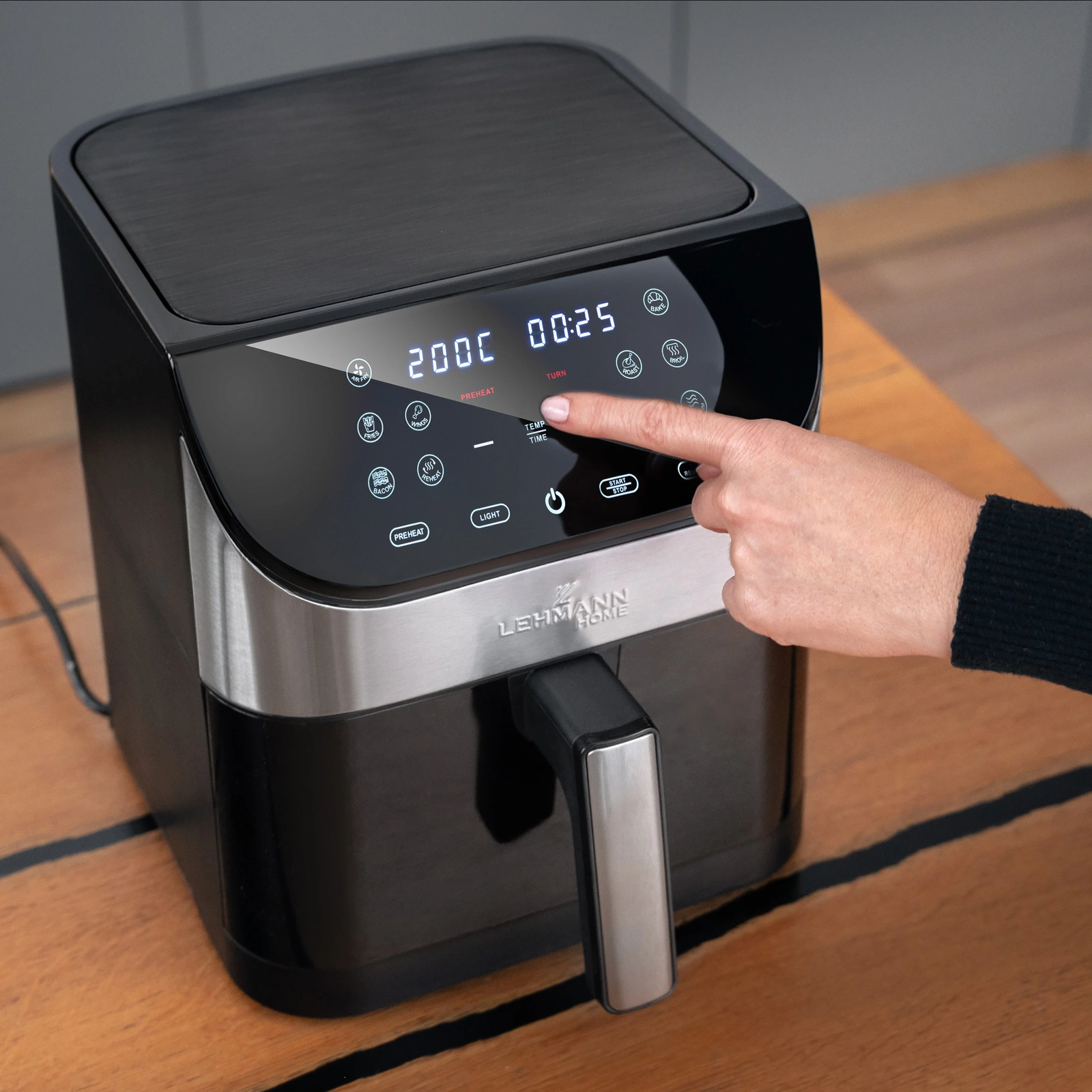 Dotykowy wyświetlacz LCD zapewnia szybki dostęp do ustawień i 12 programów. Intuicyjne ikony ułatwiają obsługę, dzięki czemu z frytkownicy Lehmann Sante  wygodnie korzystają także osoby, które wcześniej nie używały air fryera.