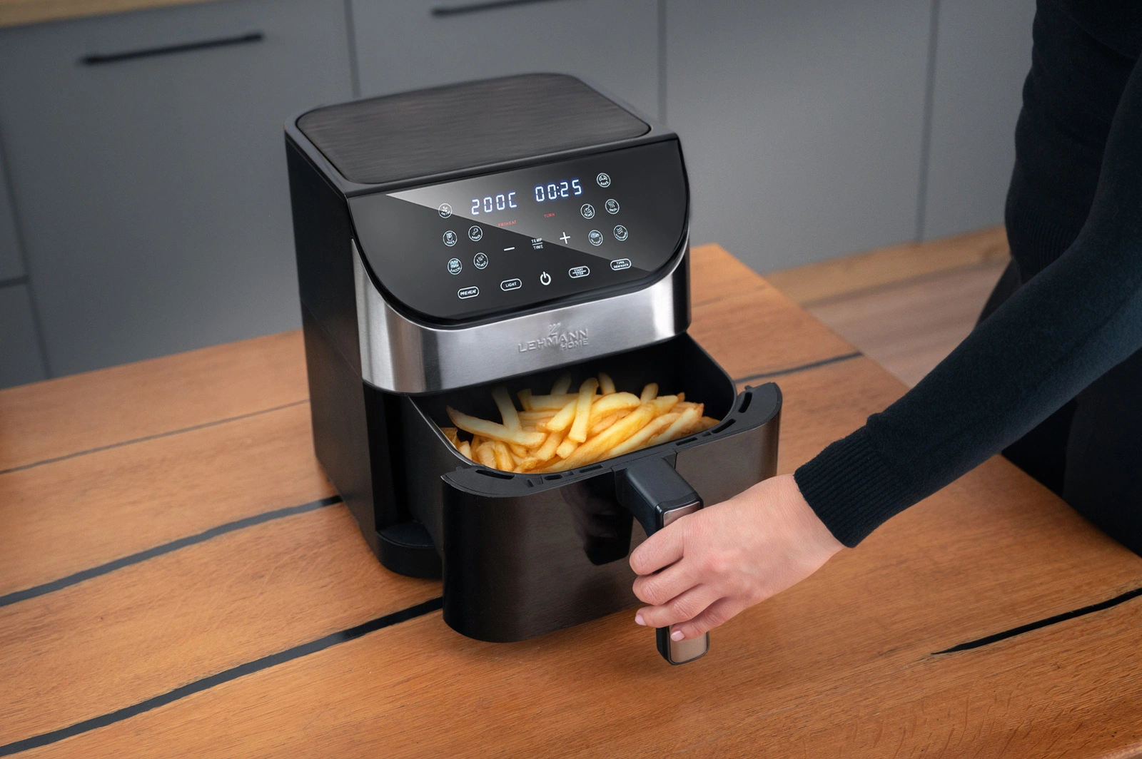 Frytkownica Lehmann Sante oferuje 12 programów, które automatycznie dobierają czas i temperaturę. Dzięki temu przygotujesz różne potrawy bez wysiłku, z powtarzalnymi i idealnymi efektami pieczenia — bez ręcznego ustawiania parametrów.
