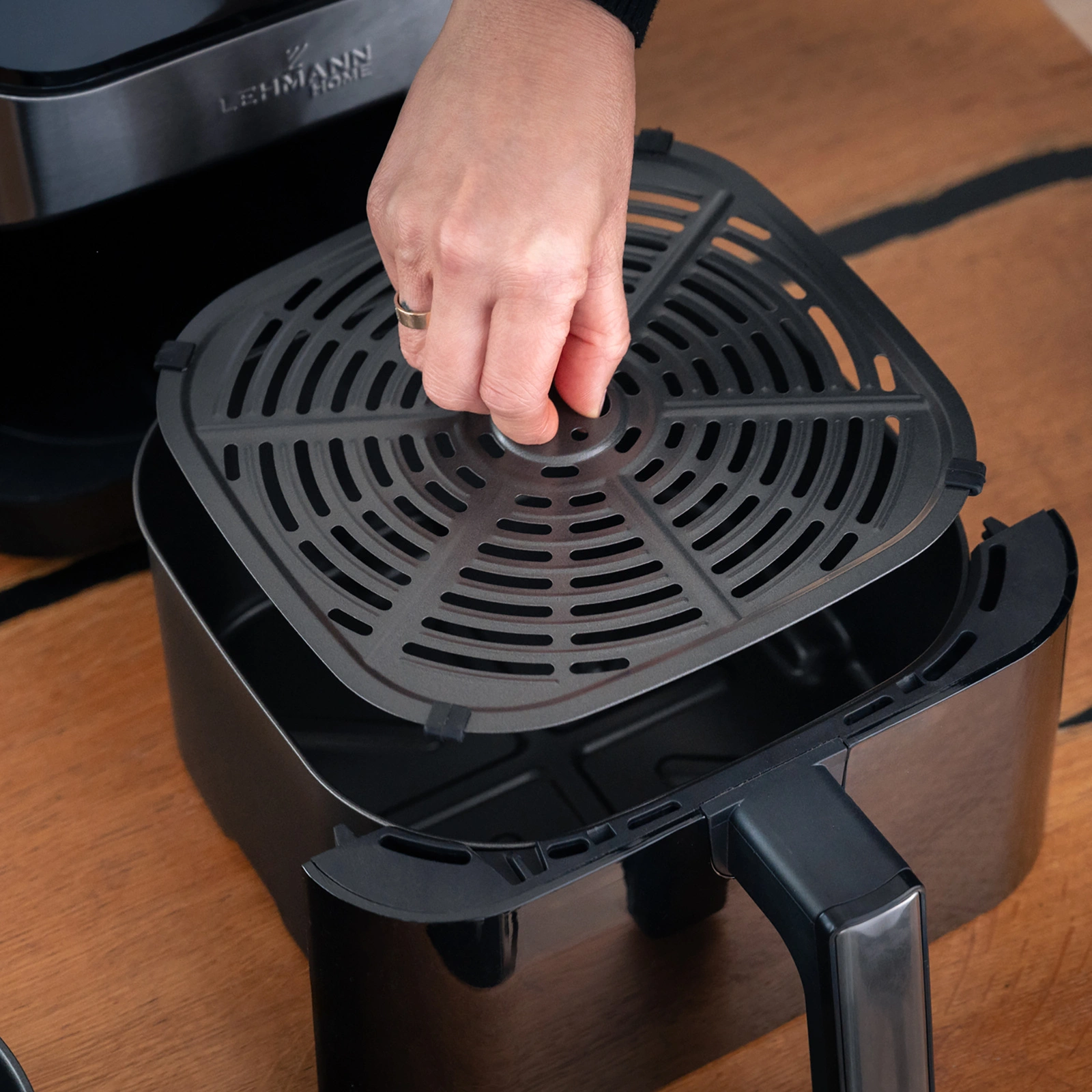 Specjalna konstrukcja kosza zapewnia swobodny przepływ powietrza, a nadmiar tłuszczu spływa na dno szuflady. Dzięki temu potrawy są lżejsze, zdrowsze i bez intensywnego zapachu smażenia — idealne do codziennego, komfortowego gotowania.