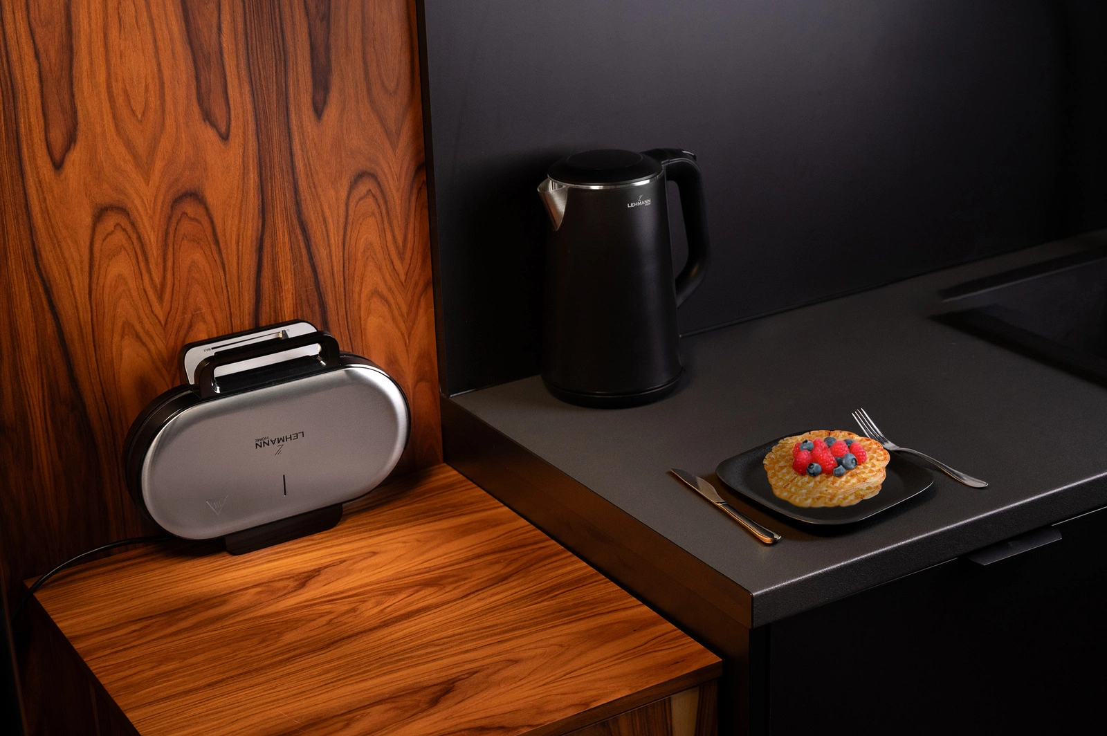 Gofrownicę Lehmann Cruncher 2000 można ustawić pionowo na blacie lub w szafce. Zajmuje niewiele miejsca, a praktyczny schowek na kabel ułatwia przechowywanie, dzięki czemu w kuchni zawsze panuje porządek.