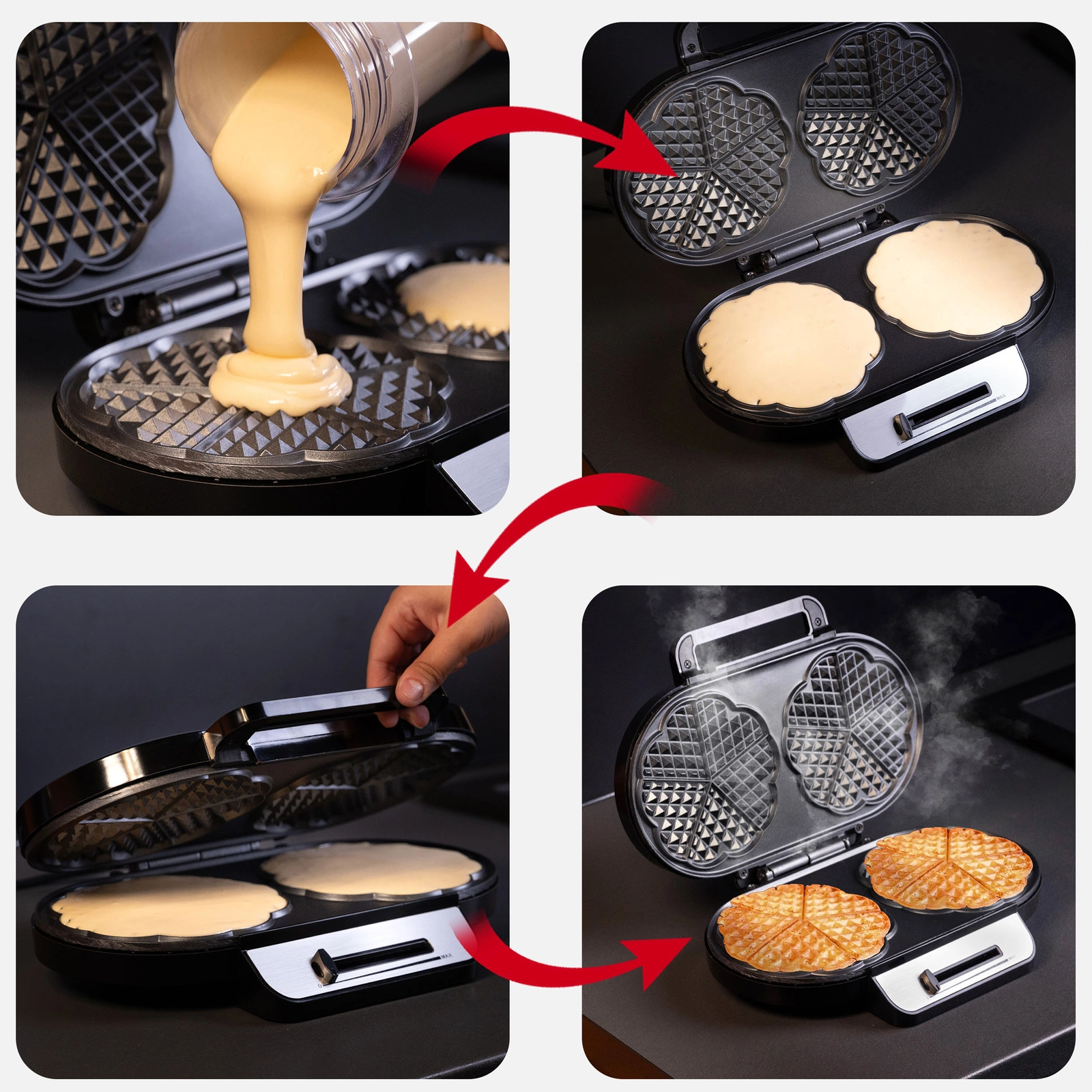 - Duże płyty grzewcze 31 × 16 cm – obszerna powierzchnia pozwala upiec dwa duże gofry jednocześnie, które można podzielić na porcje w kształcie serduszek.