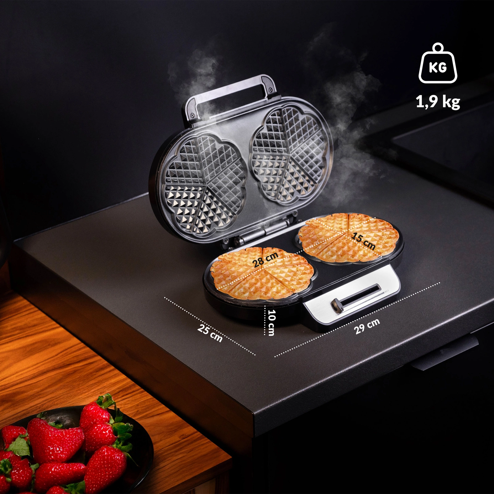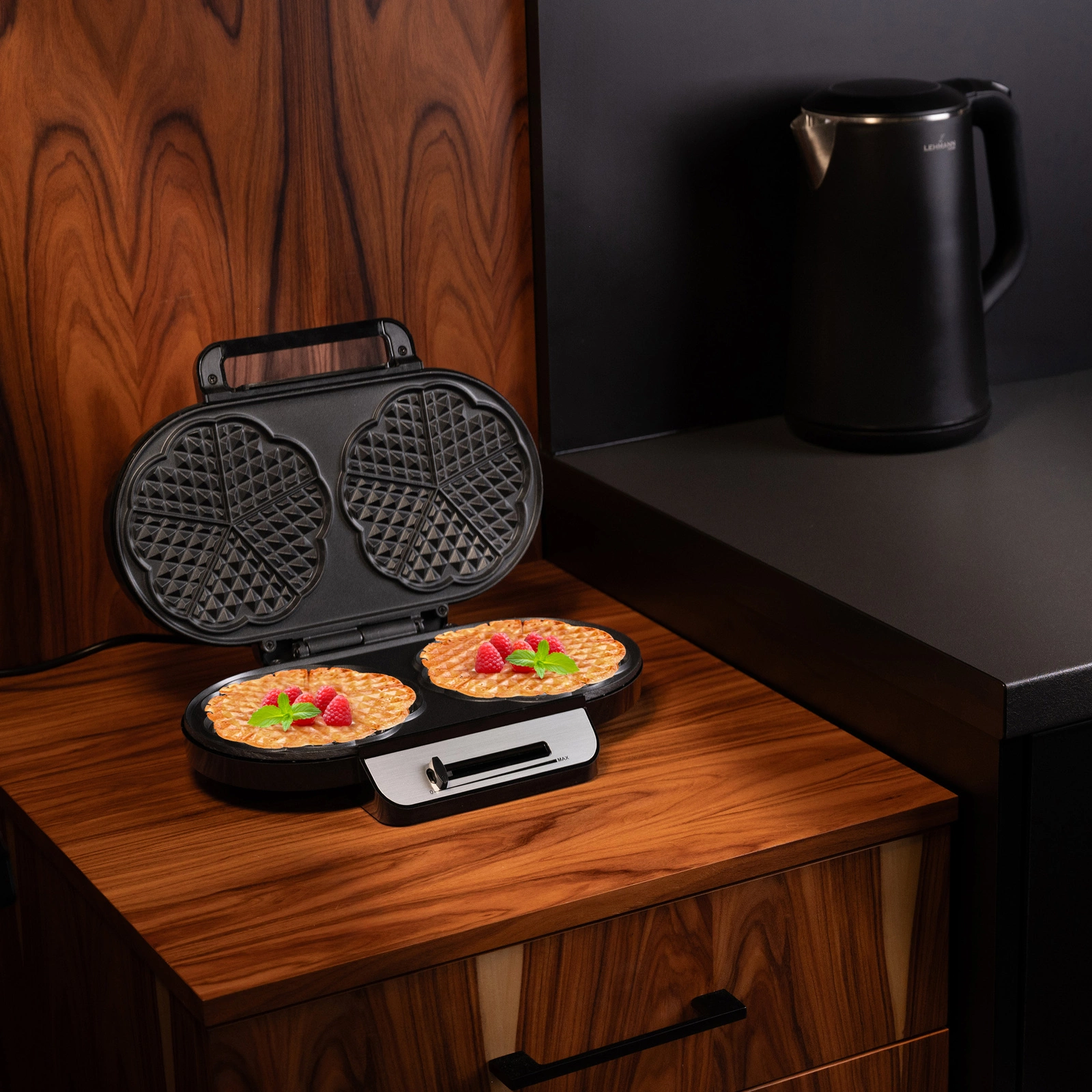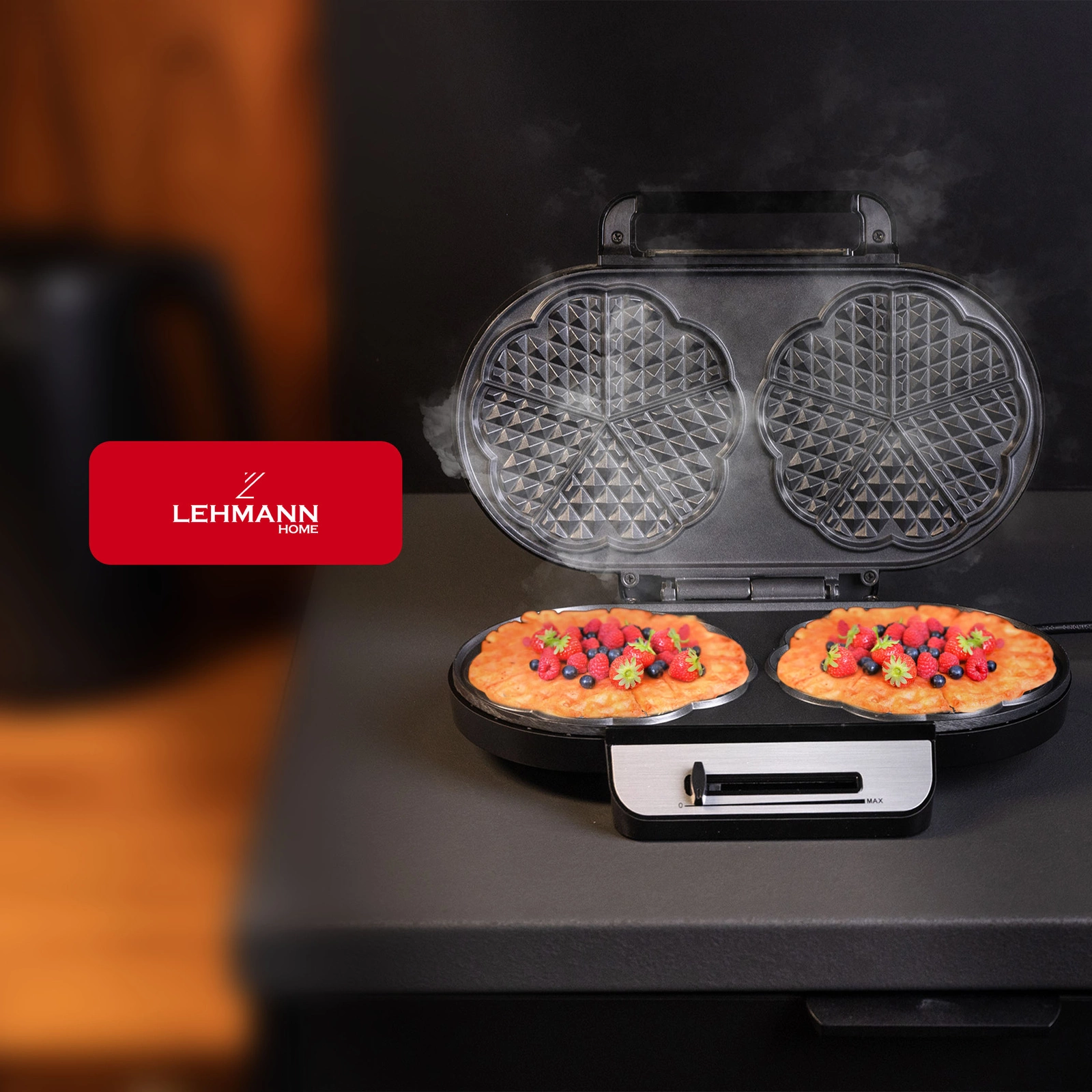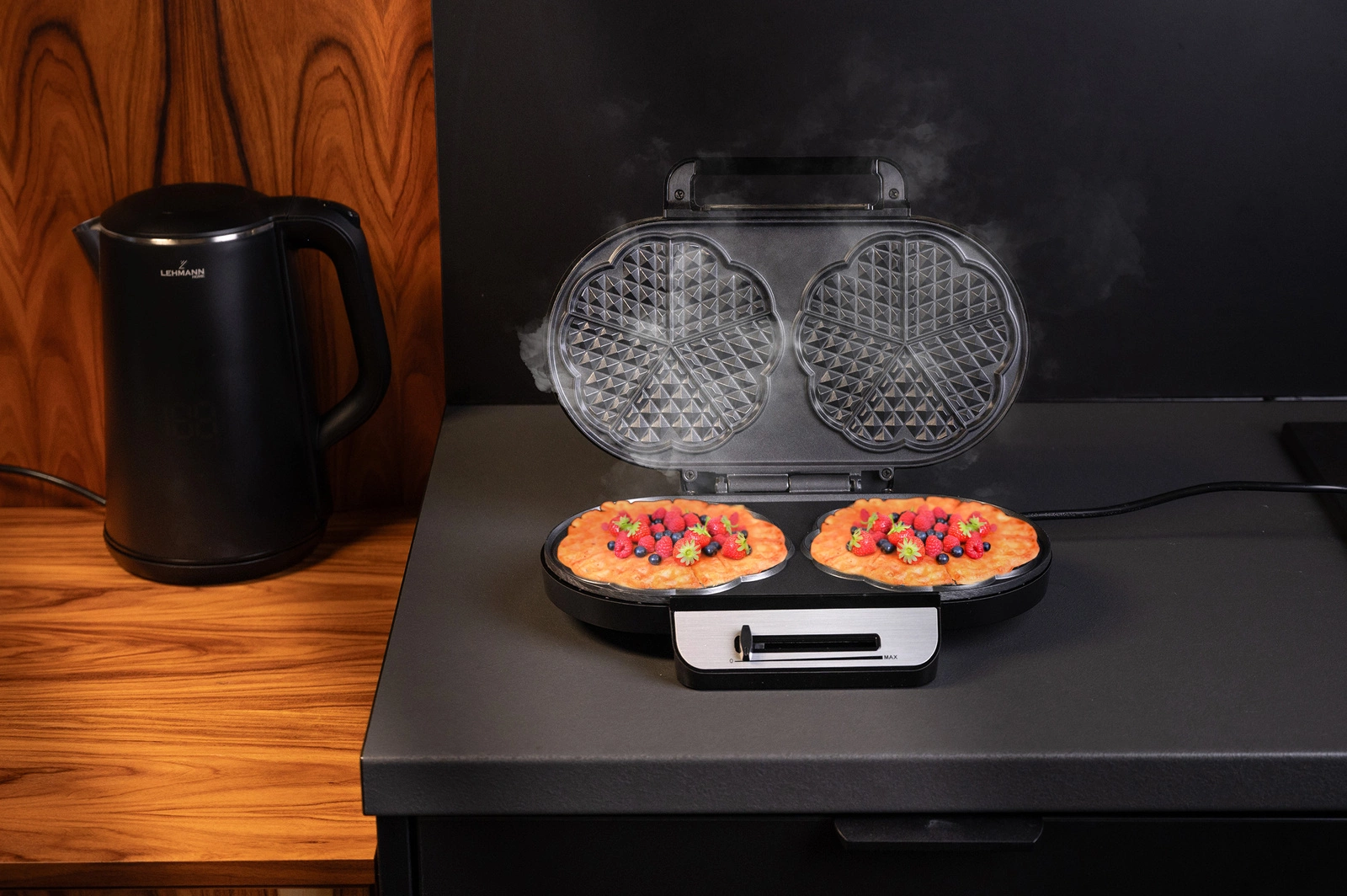 Szukasz gofrownicy o dużej powierzchni? Lehmann Cruncher 2000 ma płyty 31 × 16 cm z nieprzywierającą powłoką. Dzięki nim upieczesz złociste wafle w kształcie serduszek, które łatwo wyjąć – zawsze perfekcyjny efekt i szybkie czyszczenie.