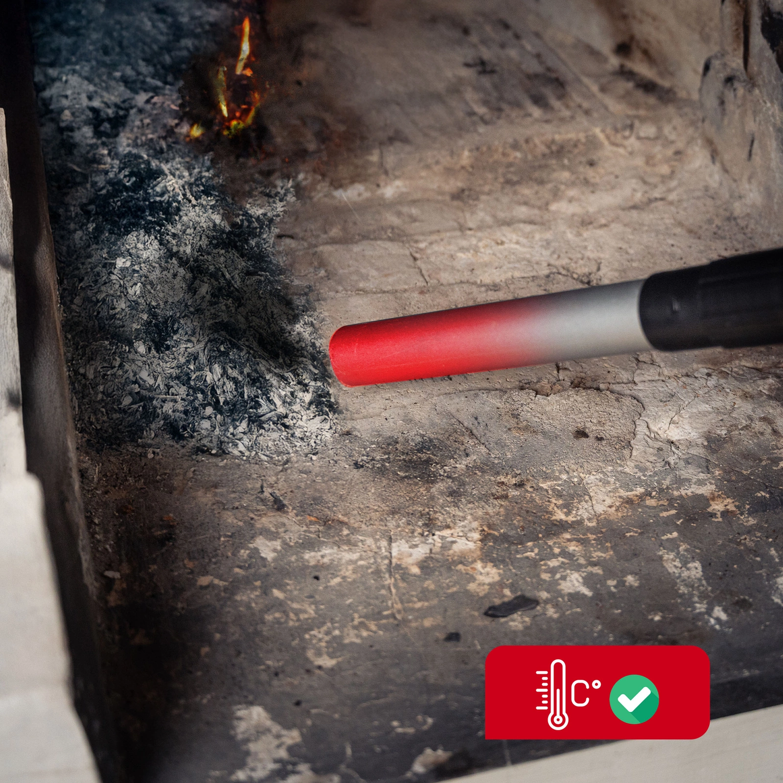 - Aluminiowa końcówka o średnicy 3 cm jest trwała i odporna na odkształcenia pod wpływem gorącego popiołu.