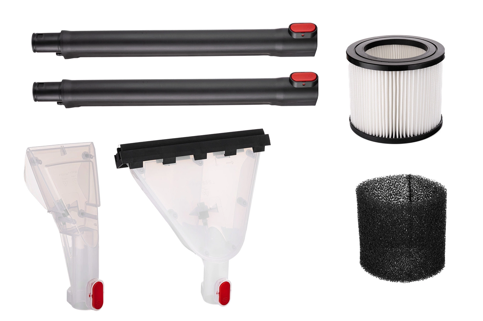 - odkurzacz x1, zbiornik na detergent x1, końcówka wąska piorąca x1, końcówka szeroka piorąca x1, przedłużki (40 cm) x2, wąż x1, filtr HEPA x1, filtr gąbkowy x1, instrukcja obsługi x1
