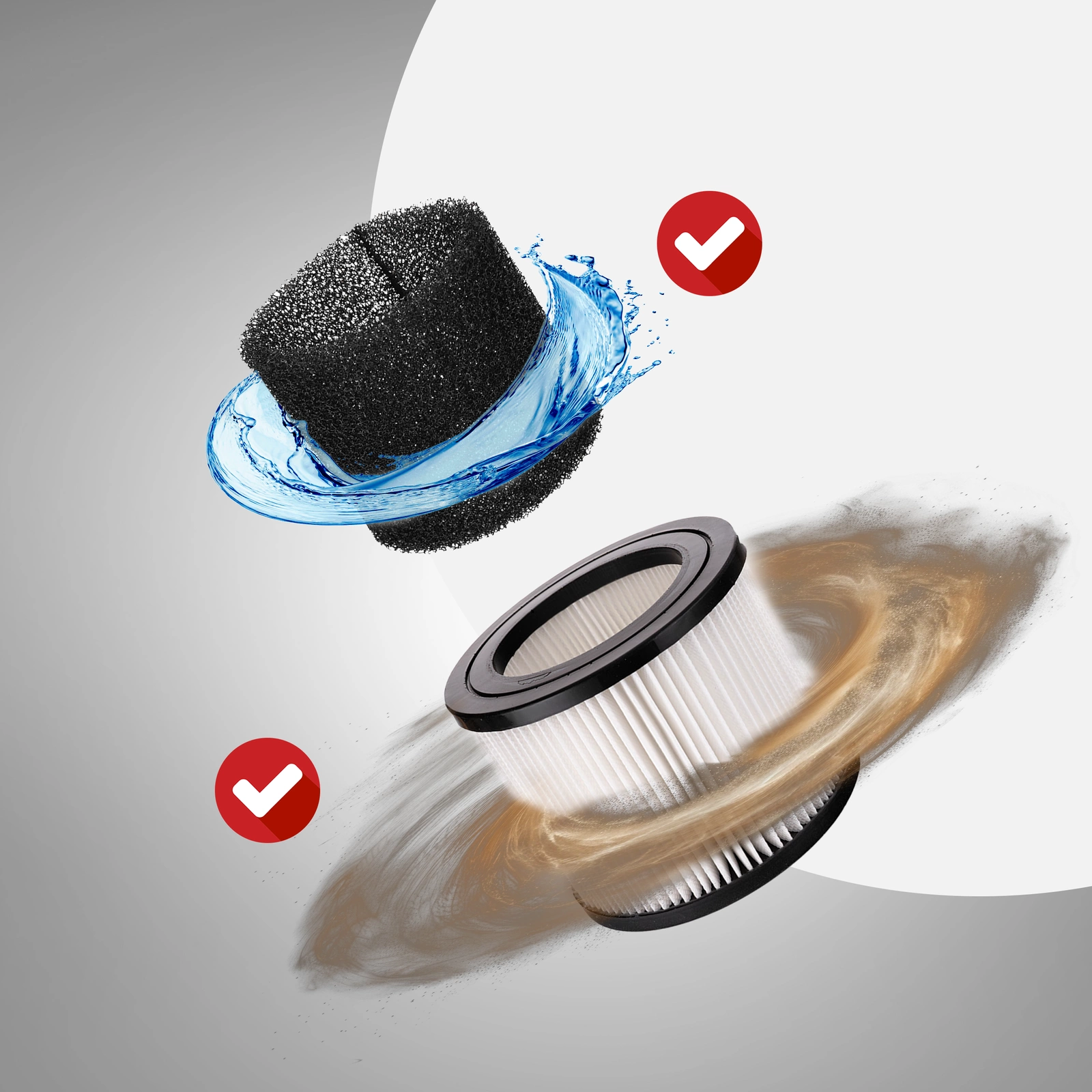 Filtry HEPA i piankowy skutecznie działają przy odkurzaniu na sucho i mokro. Stała siła ssania zapewnia niezmienną wydajność, nawet przy pełnym zbiorniku.