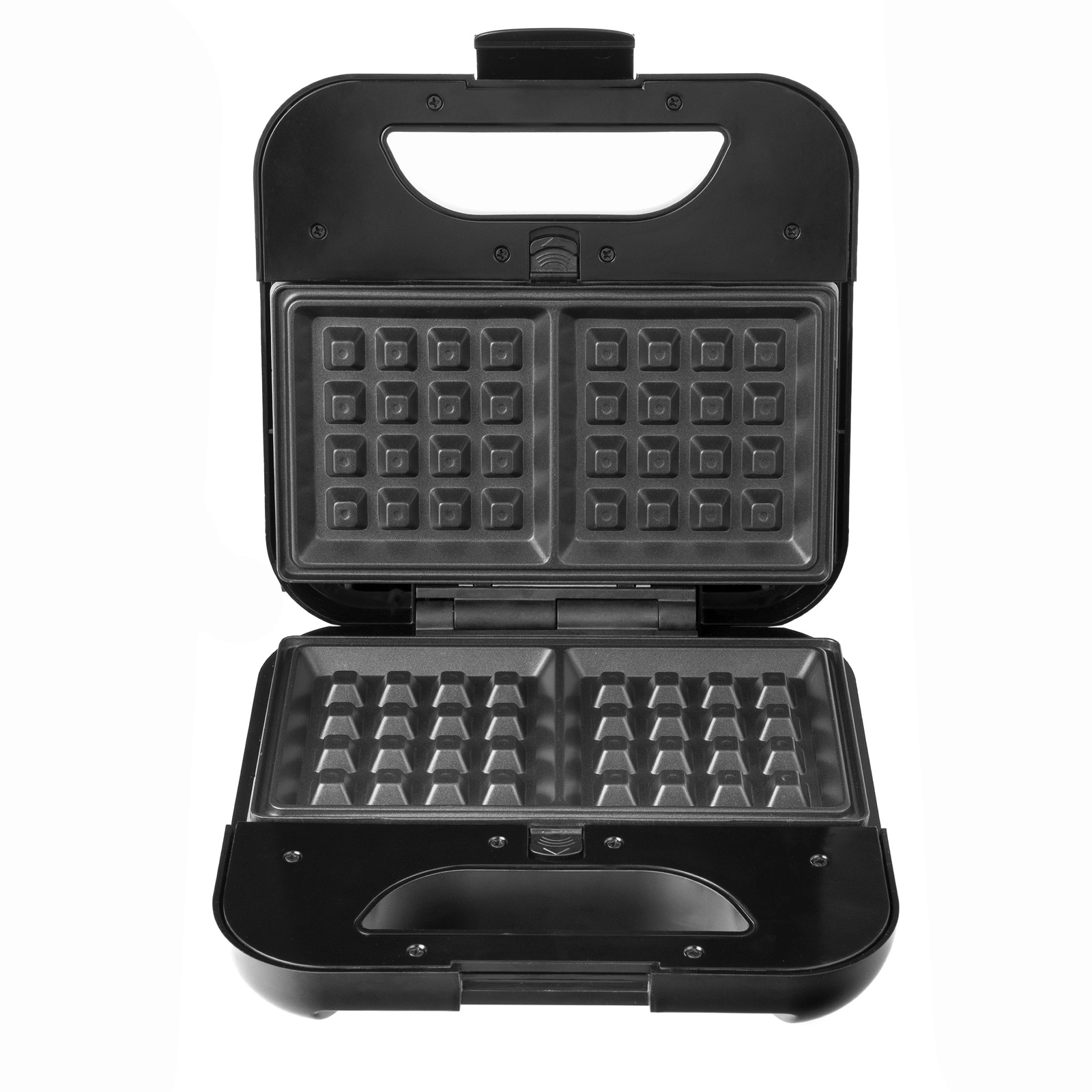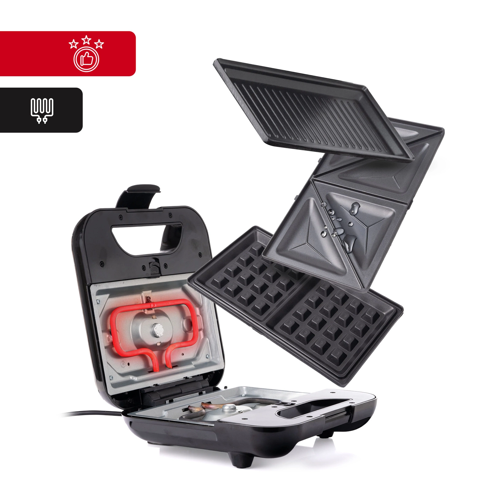 - Wymienne płyty: tosty, gofry, grill - co pozwala na wybór pomiędzy tostami, goframi i grillowaniem, a tym samym zastępuje kilka urządzeń, oszczędzając miejsce i pieniądze.