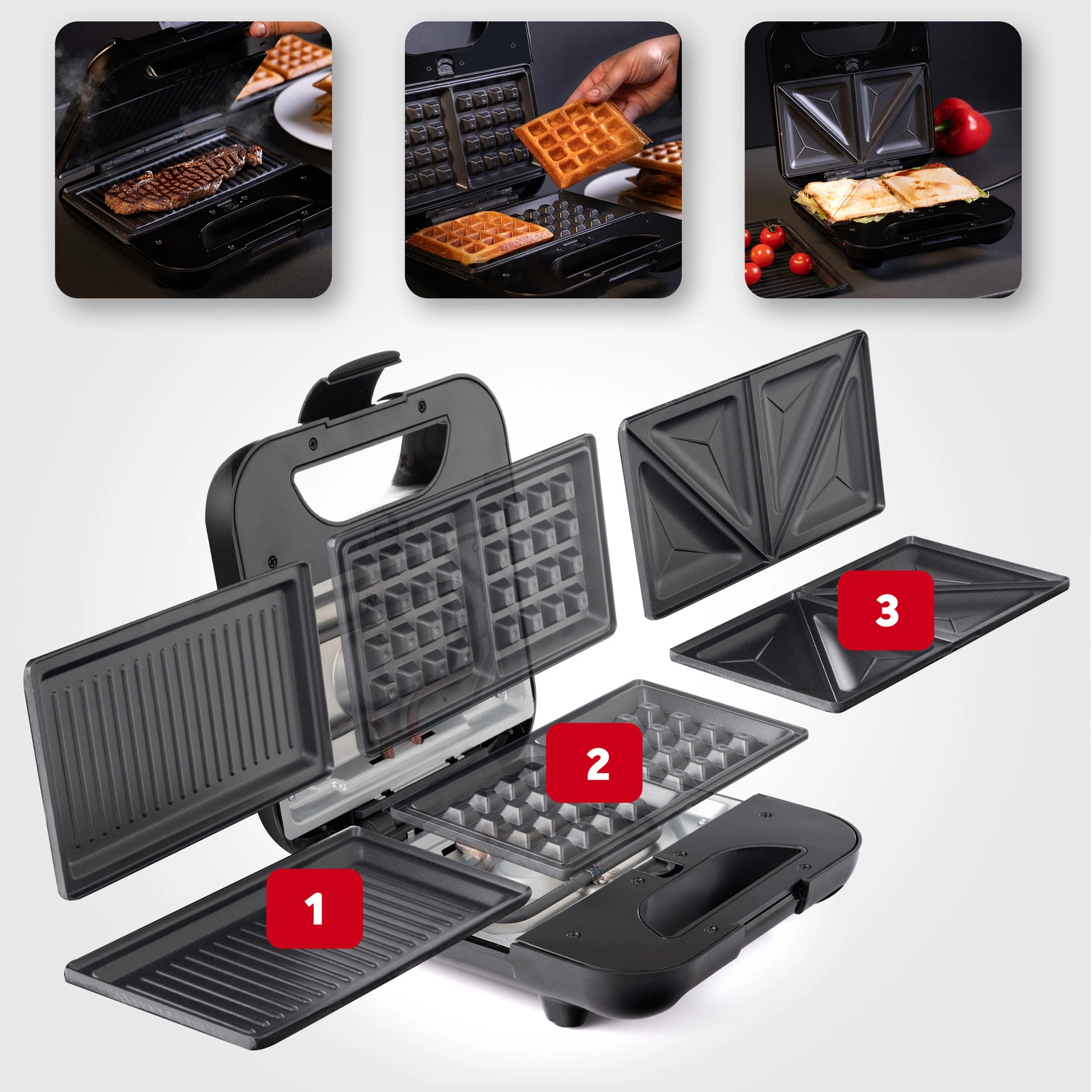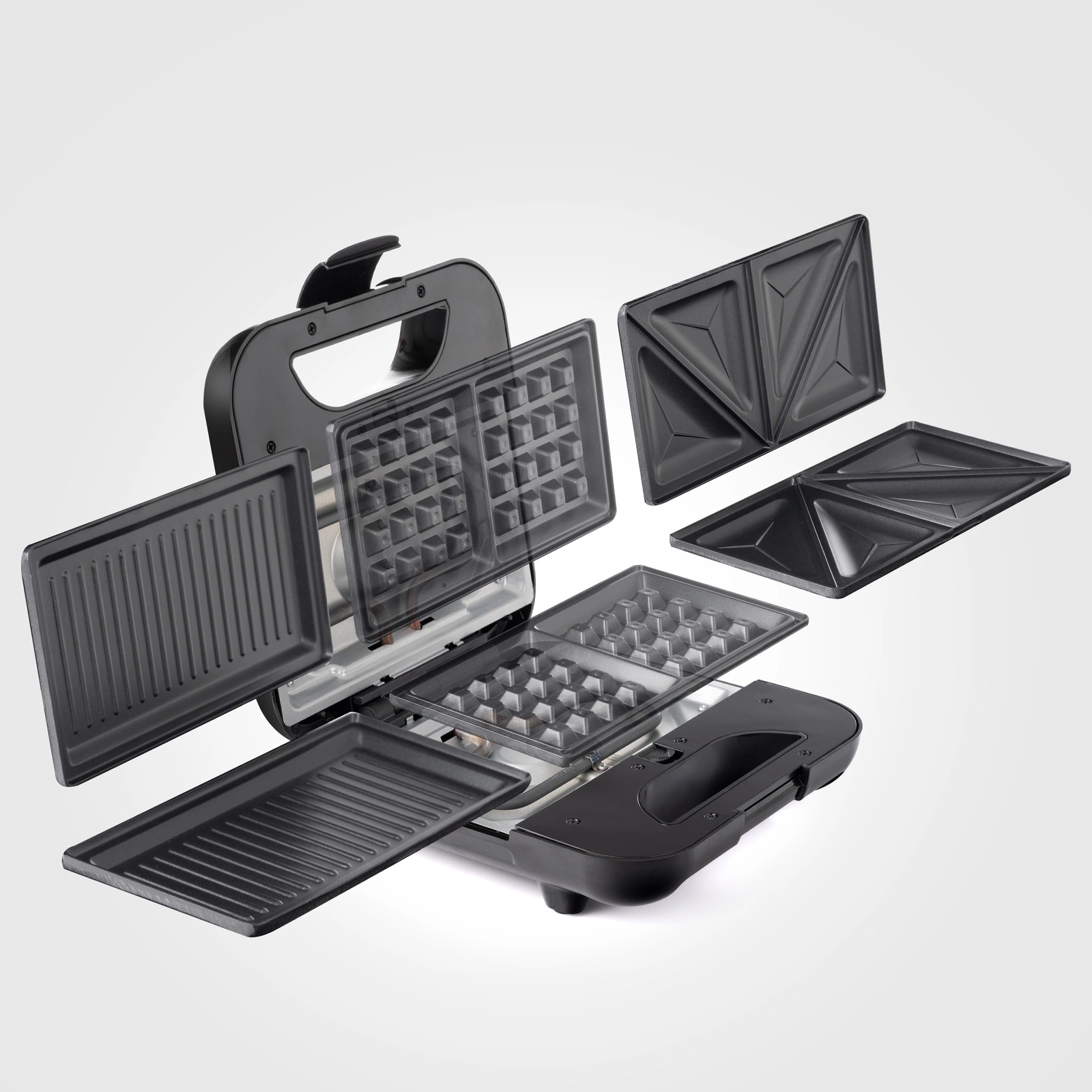 Opiekacz wyposażono w trzy zestawy wymiennych płyt: do tostów, gofrów i grilla.