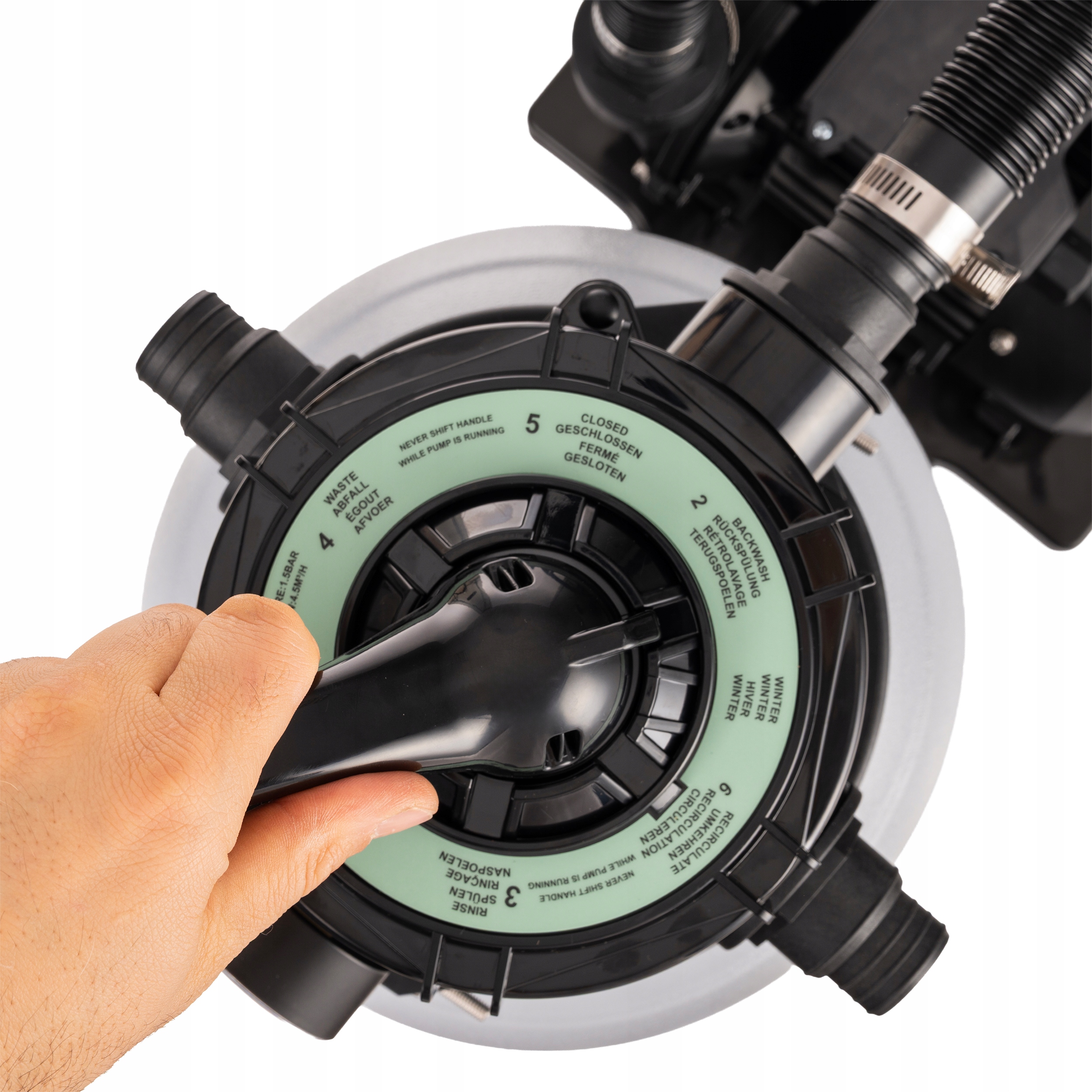 Użytkownik łatwo dopasowuje pracę filtra do aktualnych potrzeb: filtrowanie, płukanie, oczyszczanie, opróżnianie lub przygotowanie na zimę.