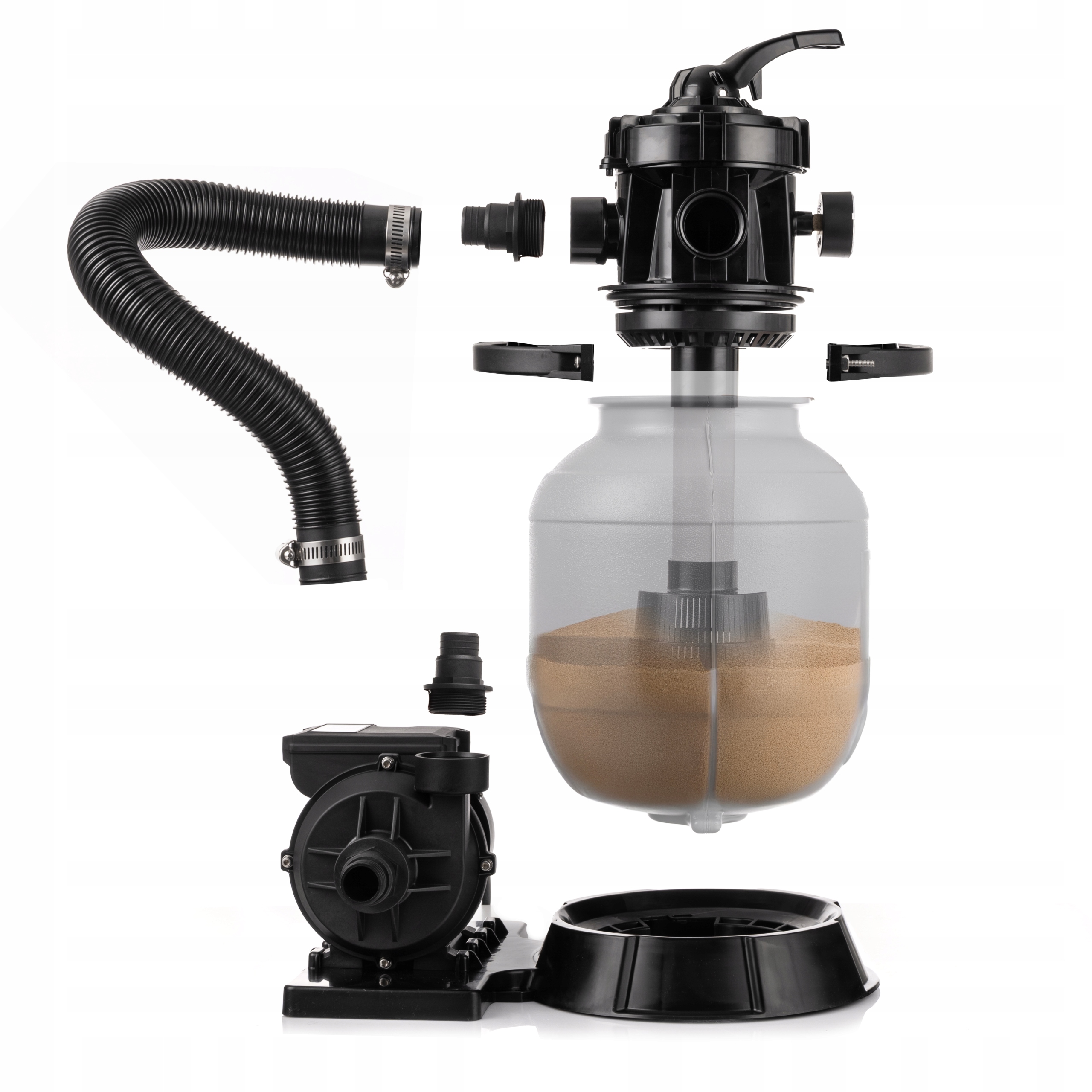 Pompa zasysa wodę i kieruje ją do 10‑litrowego zbiornika filtracyjnego, w którym znajduje się materiał filtracyjny (piasek kwarcowy). Standardowy przepływ przez filtr wynosi 4800 l/h (8000 l/h bez piasku), co pozwala skutecznie oczyszczać wodę nawet w basenach o dużej powierzchni.