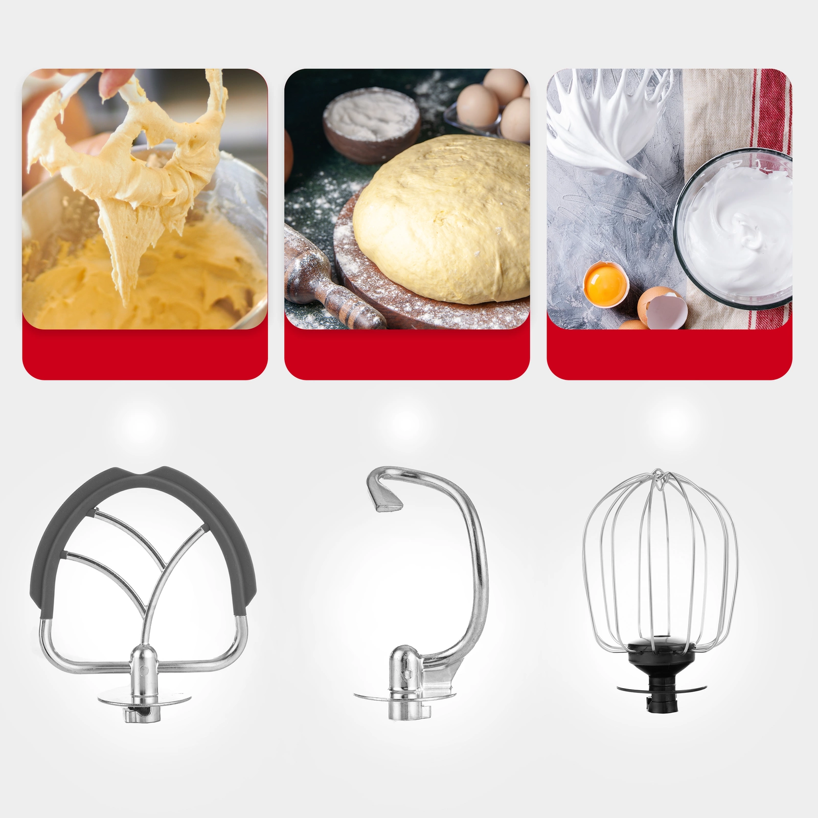 - Silikonowe mieszadło 360 stopni: Zapomnij o niedomieszanych składnikach! Precyzyjnie zbiera masę z całej misy, gwarantując idealnie gładkie rezultaty.