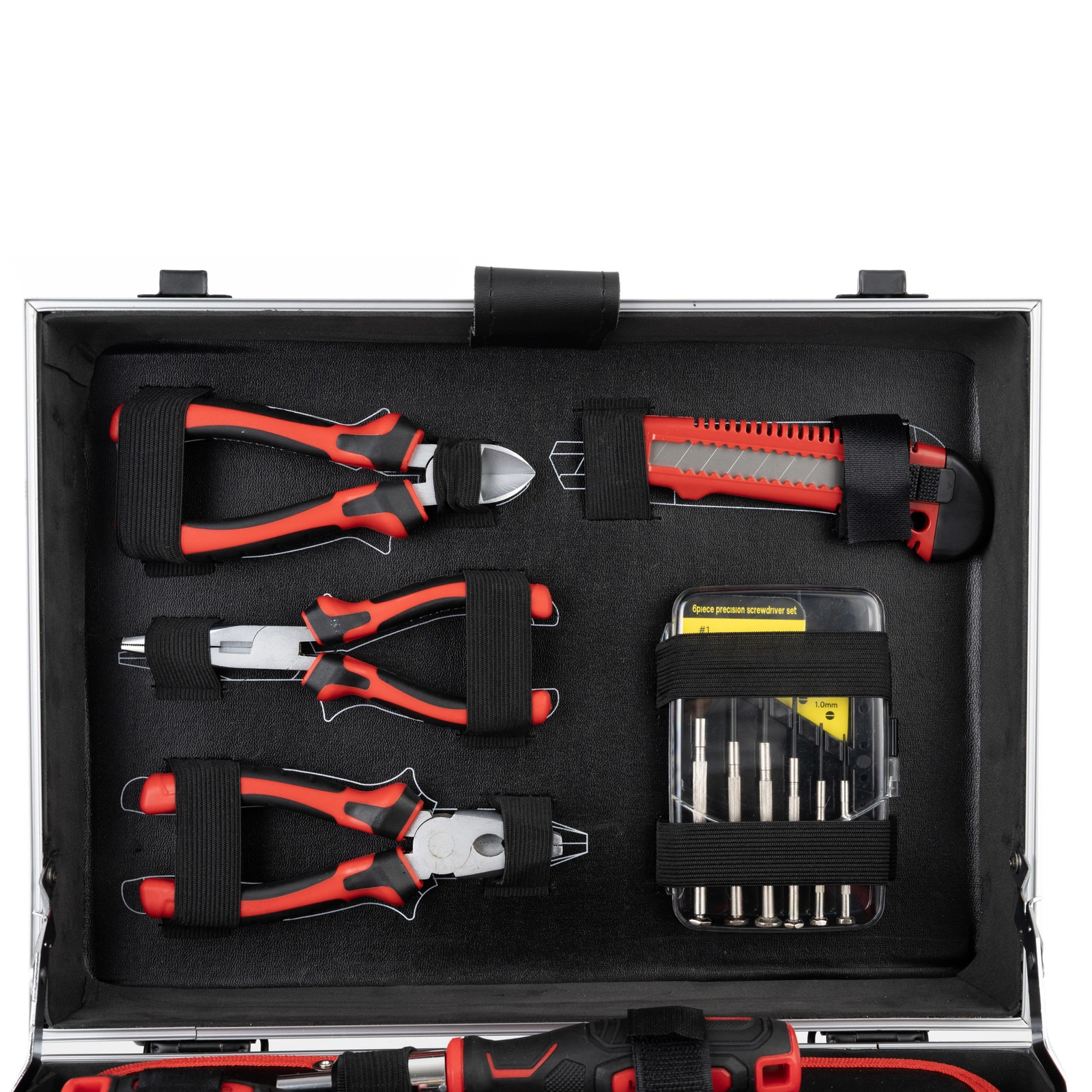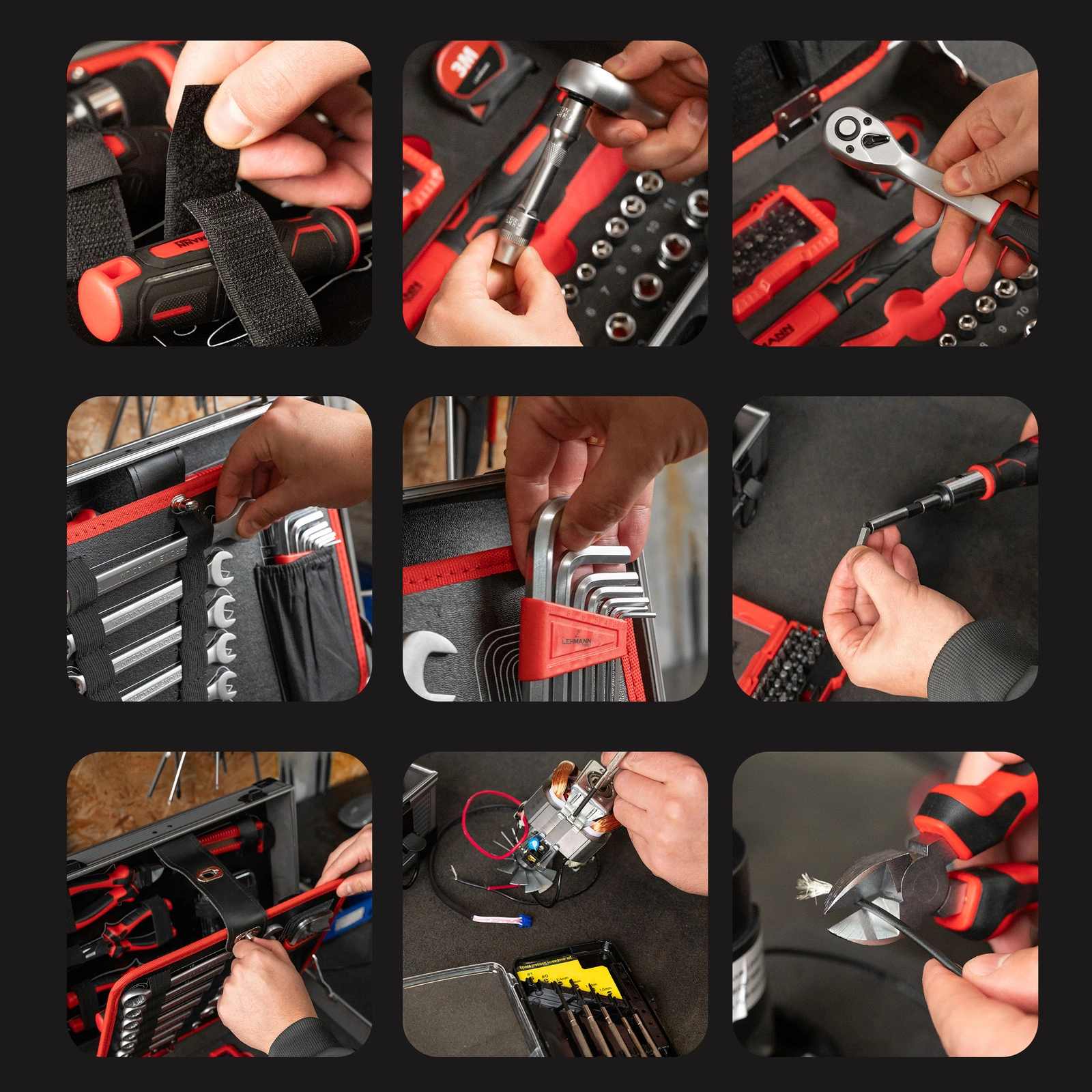 - 88 elementów w jednej walizce – kompletny zestaw do każdej naprawy. Zawiera klucze, szczypce, wkrętaki, bity i grzechotkę – wszystko, czego potrzebujesz do prac domowych, montażu i majsterkowania. Idealny do domu, warsztatu i garażu – zawsze gotowy do działania.