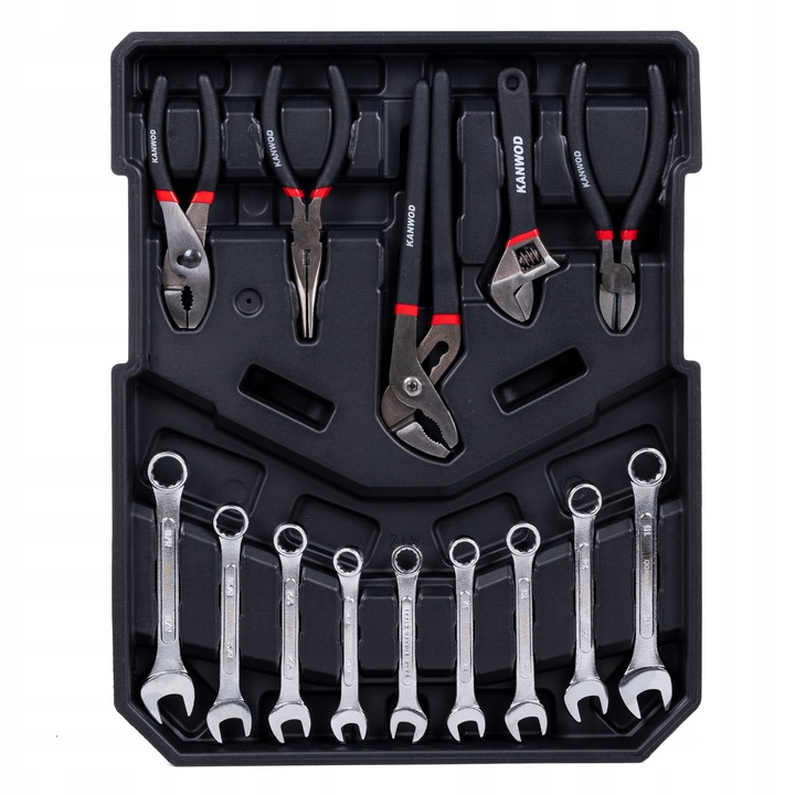 Precyzyjne szczypce, klucze i kombinerki umieszczone w dedykowanych gniazdach ułatwiają szybki dostęp do narzędzi. Każdy element ma swoje miejsce, co przyspiesza pracę i zwiększa wygodę podczas napraw i montażu.