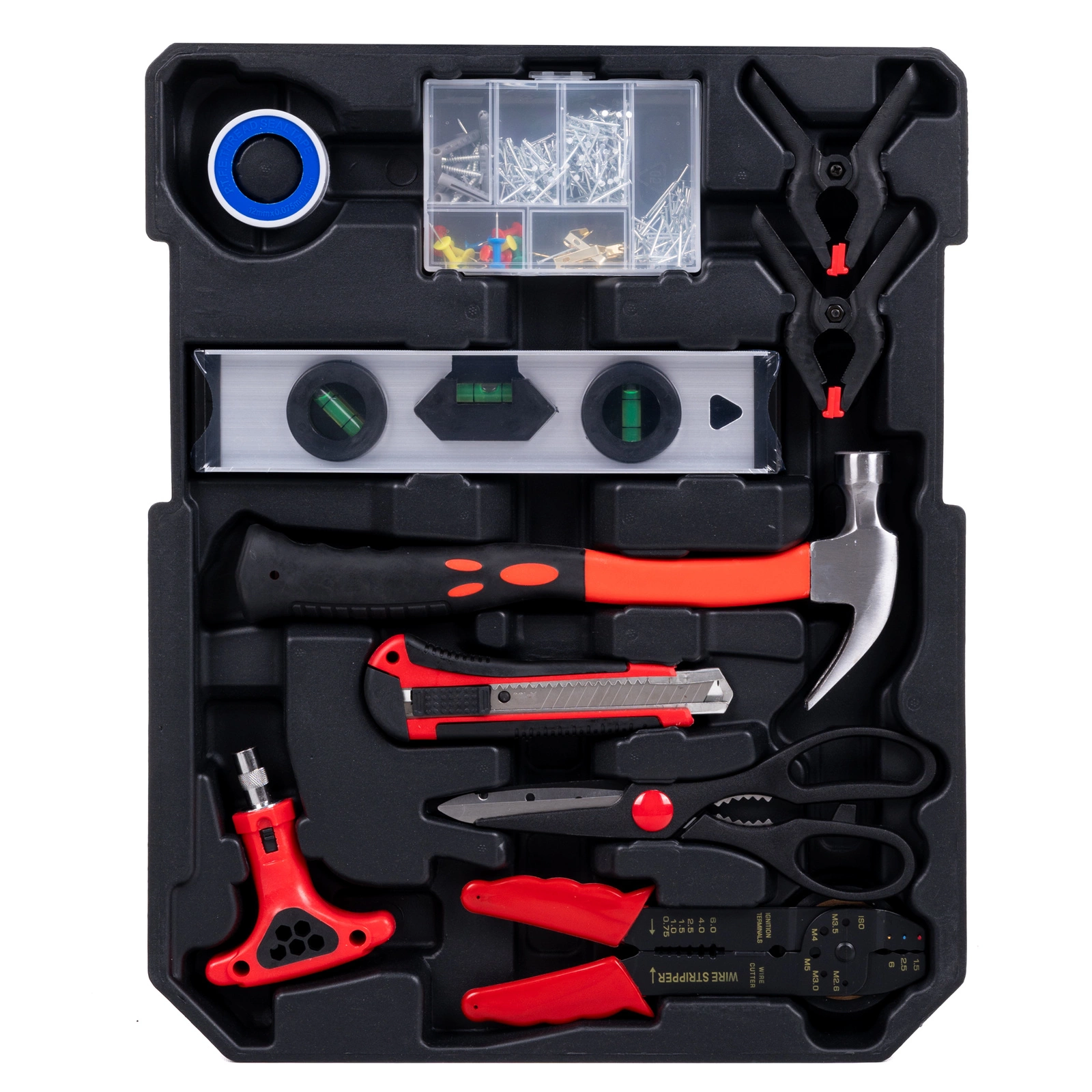 Młotek, poziomica, nożyk, nożyczki i stripper do przewodów są umieszczone w dopasowanych gniazdach. Dzięki temu masz pod ręką wszystko, czego potrzebujesz do precyzyjnych i szybkich prac w domu lub warsztacie.