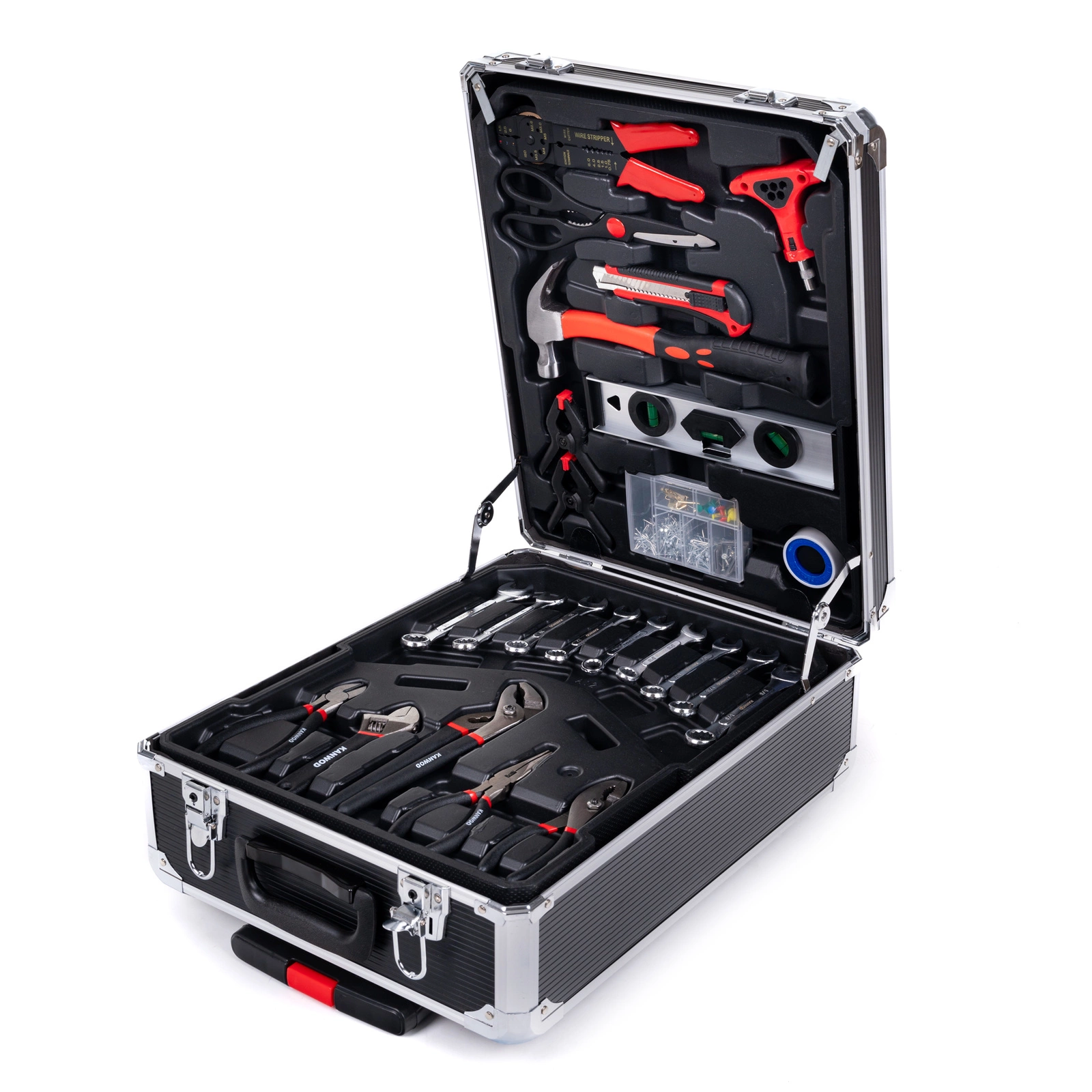Walizka narzędziowa z organizerami to kompleksowy zestaw do napraw, prac domowych, serwisowych i majsterkowania. Solidne narzędzia, wygodny system przechowywania i mobilna konstrukcja z kółkami sprawiają, że to idealny wybór zarówno do domu, jak i do profesjonalnego użytku.