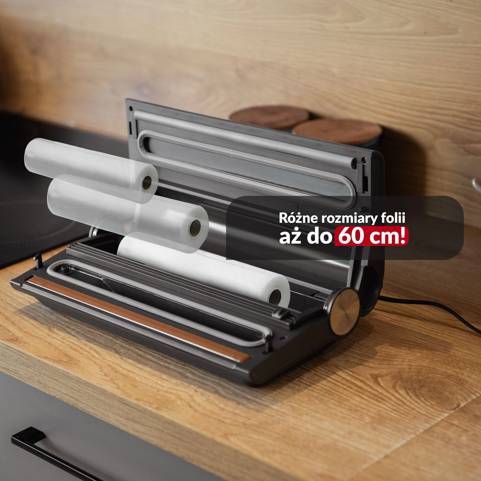 - Wbudowany nożyk – łatwe docinanie folii bez nożyczek.